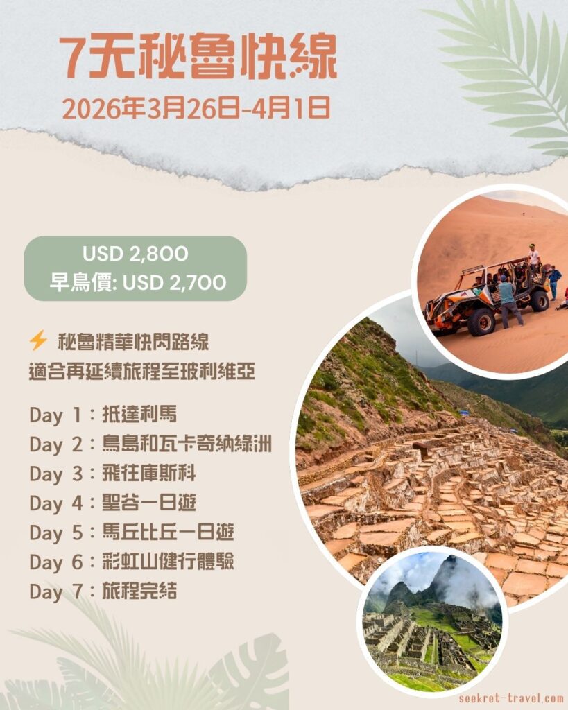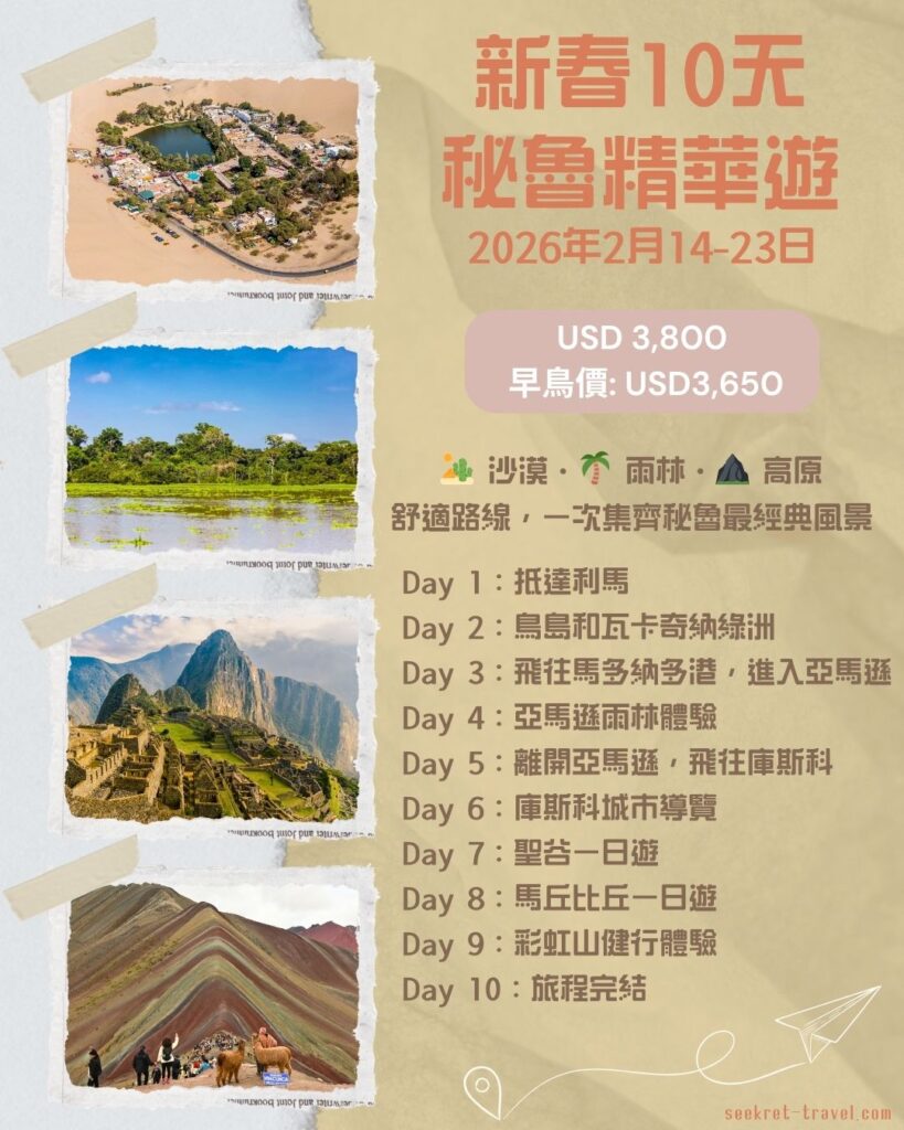 秘遊家 2026 秘魯旅行團 帶你走進不一樣的祕魯旅程 聯絡我們 🚨【2026 秘魯旅行團|正式開放報名】🚨 新春10天秘魯精華遊 2026年2月14 - 23日 每位: USD3,800早鳥價:USD3,650*早鳥價適用於出發前兩個月確認之報名 詳情 內陸航班 地面交通 本地導遊+中文地接 7天秘魯快線 2026年3月26日-4月1日 每位: USD2,800早鳥價:USD2,700*早鳥價適用於出發前兩個月確認之報名 詳情 內陸航班 地面交通 本地導遊+中文地接 復活節 10天歷險之旅 2026年4月3 - 14日 每位: USD3,400早鳥價:USD3,250*早鳥價適用於出發前兩個月確認之報名 詳情 全程所有活動 地面交通 本地導遊+中文地接 勞動節 10天 高原探秘 2026年5月1 - 10日 每位: USD3,400早鳥價:USD3,250*早鳥價適用於出發前兩個月確認之報名 詳情 全程所有活動 地面交通 本地導遊+中文地接 立即預訂 Please enable JavaScript in your browser to complete this form.名字: * 人數: 電話: 電郵: 電郵: *電話: *國籍:行程: *--- Select Choice 請選擇 ---新春10天秘魯精華遊(2026年2月14-23日)7天秘魯快線 (2026年3月26日-4月1日)復活節10天歷險之旅(2026年4月3-14日)勞動節10天高原探秘(2026年5月1-10日)其他人數: *--- Select Choice 請選擇 ---1234566+備注:立即預訂 想了解更多? 歡迎聯絡我們查詢各種行程、客製化服務或合作機會。我們樂意為你提供協助! 聯絡我們 客戶評價 行程好愉快呀, 多謝你幫手安排,基本上全程都有人睇住,乜都唔洗煩 Kit 香港旅客 | 馬丘比丘兩日一夜火車之旅 行程安排得非常貼心,導遊講解清楚!第一次去馬丘比丘完全冇壓力,景點同影相位安排得好好。 Nicole 香港旅客 | 17天秘魯深度之旅 秘魯之旅超出預期!Cusco 市區導覽同聖谷行程都安排得非常好,特別係食住體驗都好有地道特色。亞馬遜叢林探險完咗細個嘅夢想! Kelvin 香港旅客 | 8天失落之城與叢林探險之旅 好適合第一次去南美的朋友,秘遊家提供了很多實用資訊,還有中文客服協助。強烈推薦! Jenny 台灣旅客 | 9天秘魯高原健行之旅